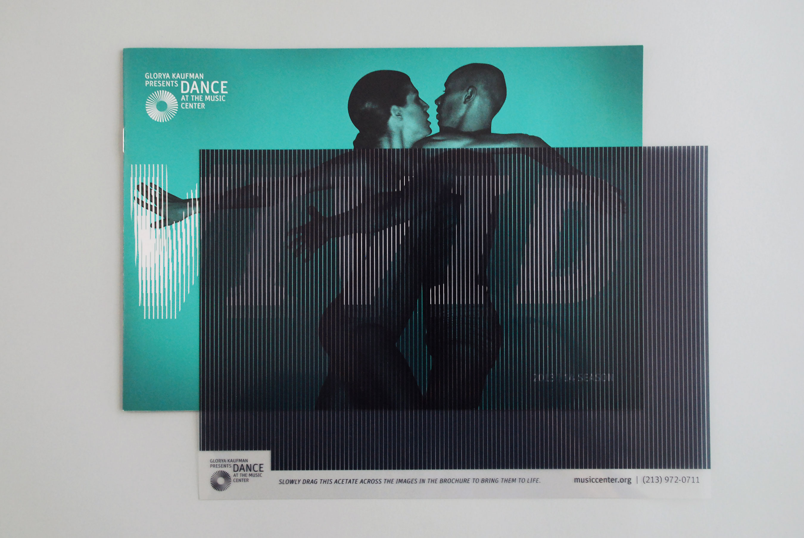 How do you create excitement about the living, breathing art form that is dance using the printed page? Traditionally you would use beautiful still photography, but we’ve done that hundreds of times and wanted to push ourselves to try something unique. To our delight, long-time client, Dance at The Music Center, was feeling adventurous too. We employed a cinematic technique called ombro that uses a semitransparent fence passed across images that are separated into frames within one still to create an animated brochure.