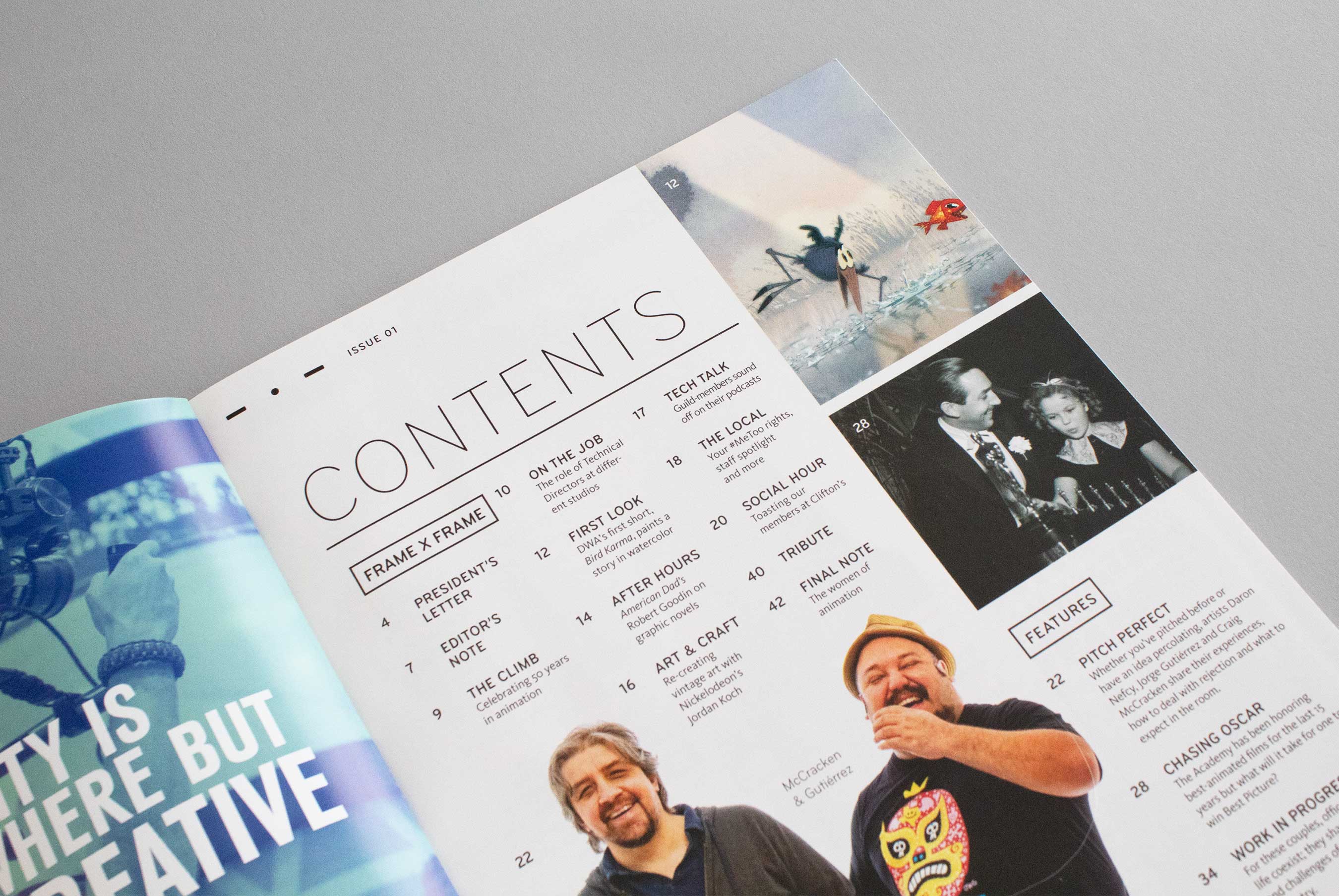 Keyframe is designed to feel like an open exhibition space for TAG members—a place to unveil the many layers of skill and refinement that go into an animated work. We peel those layers all the way back to the artists themselves, inventively exploring the relationship between the artist and their creations, whether those are characters or entire worlds. As a nod to its predecessor, the Keyframe masthead was designed to use the simple shapes of a peg-board used in hand drawn animation, a graphic element. That simple design is carried throughout the issue in the column eyebrows, with the rounded quality of that graphic reflected in the typography and all line work to create a subtle softness throughout.