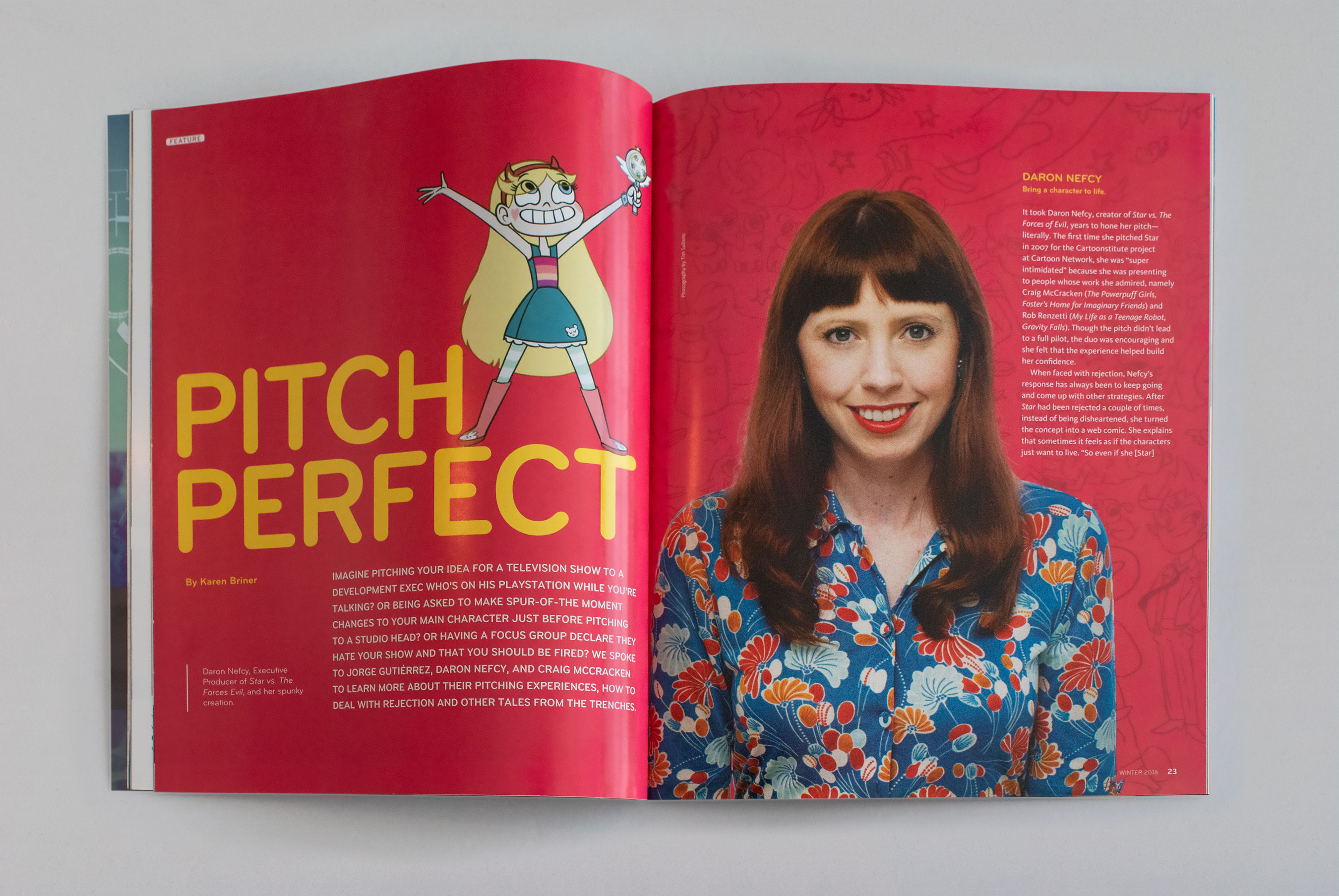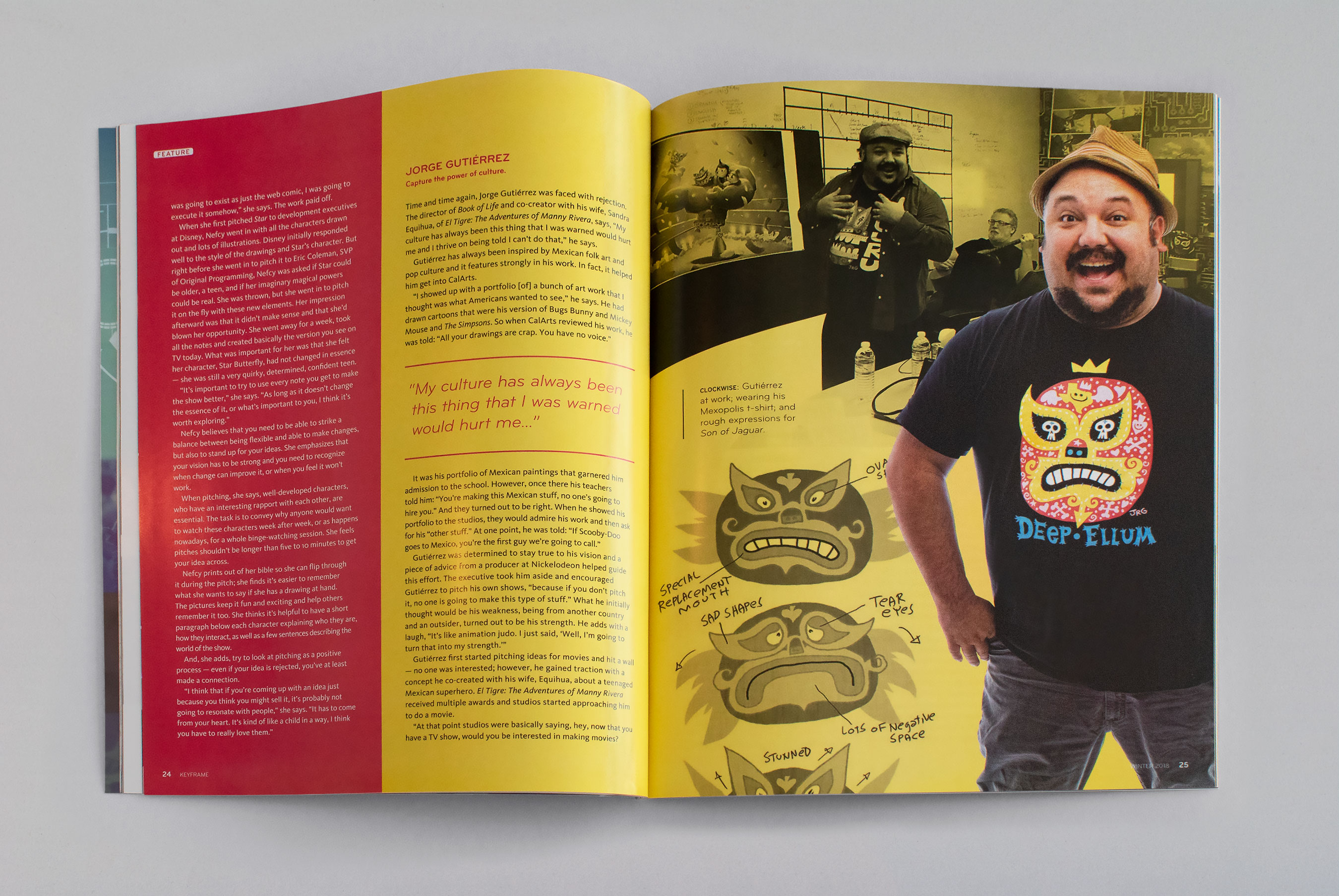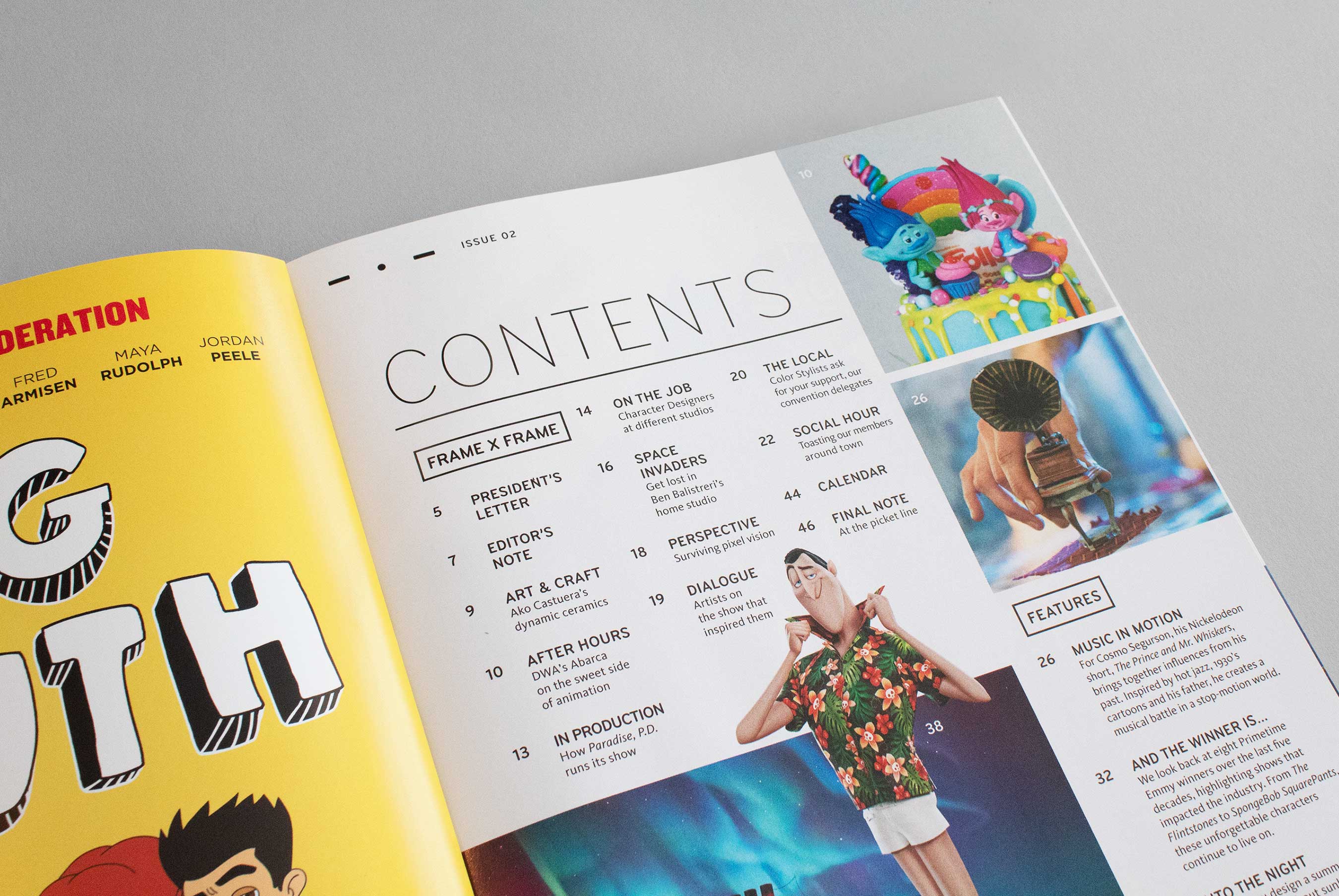 For years the Animation Guild distributed a small, black and white, photocopied newsletter called The Peg-board. This simple newsletter was used to communicate basic union issues: contract negotiation updates, wage concerns, scheduled events, and the occasional artist spotlight. In 2017 the Executive Board of TAG voted to elevate their industry presence to a level on par with other entertainment unions like the Director’s Guild and Writer’s Guild, both with slick 4-color, perfect-bound magazines with striking photography and cover-to-cover advertising. But TAG wanted to go a step further—to bring humanity and personality to the organization and its members—not just showcase bells, whistles and tech. This would not be a trade publication, this would be an art publication.
